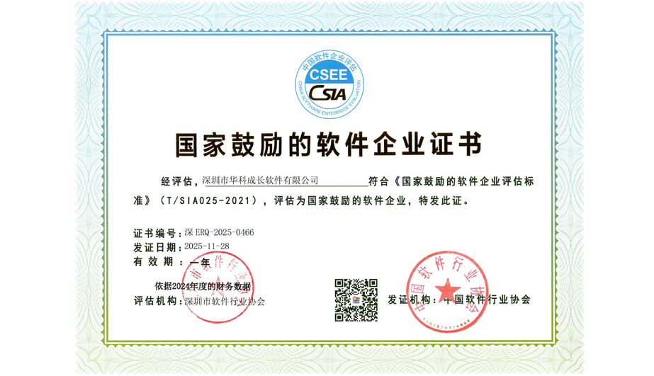 经过深圳市软件行业协会的全方位评估,华科成长荣获中国软件行业协会颁发的【国家鼓励的软件企业证书】。该证书是国家为鼓励软件企业的发展,对从事信息技术服务等业务的企业进行的一种资质认定,旨在扶持信息技术和软件领域的重点优秀企业,激发行业创新能力,引领行业奋进前行。